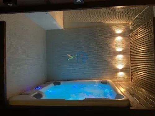?Piso superior: escritório/quarto de visitas, lavabo, terraço semicoberto com área técnica, área de estar, área gourmet com churrasqueira elétrica, banheira de hidromassagem com cromoterapia para cinco pessoas e paisagismo.