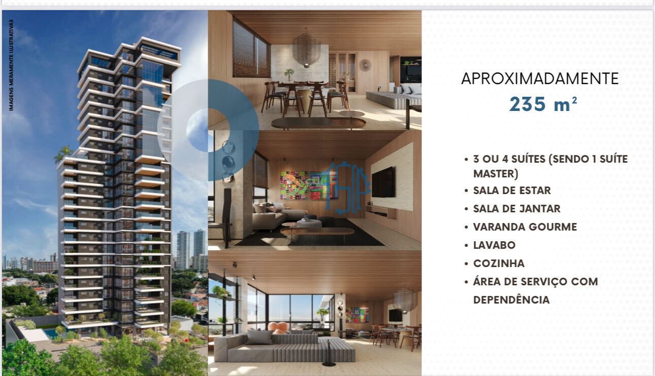 Apartamento com 235 m² com 03 suítes, sala de estar e jantar, cozinha, área de serviço com dependência, lavabo, varanda gourmet e 03 vagas de garagem.