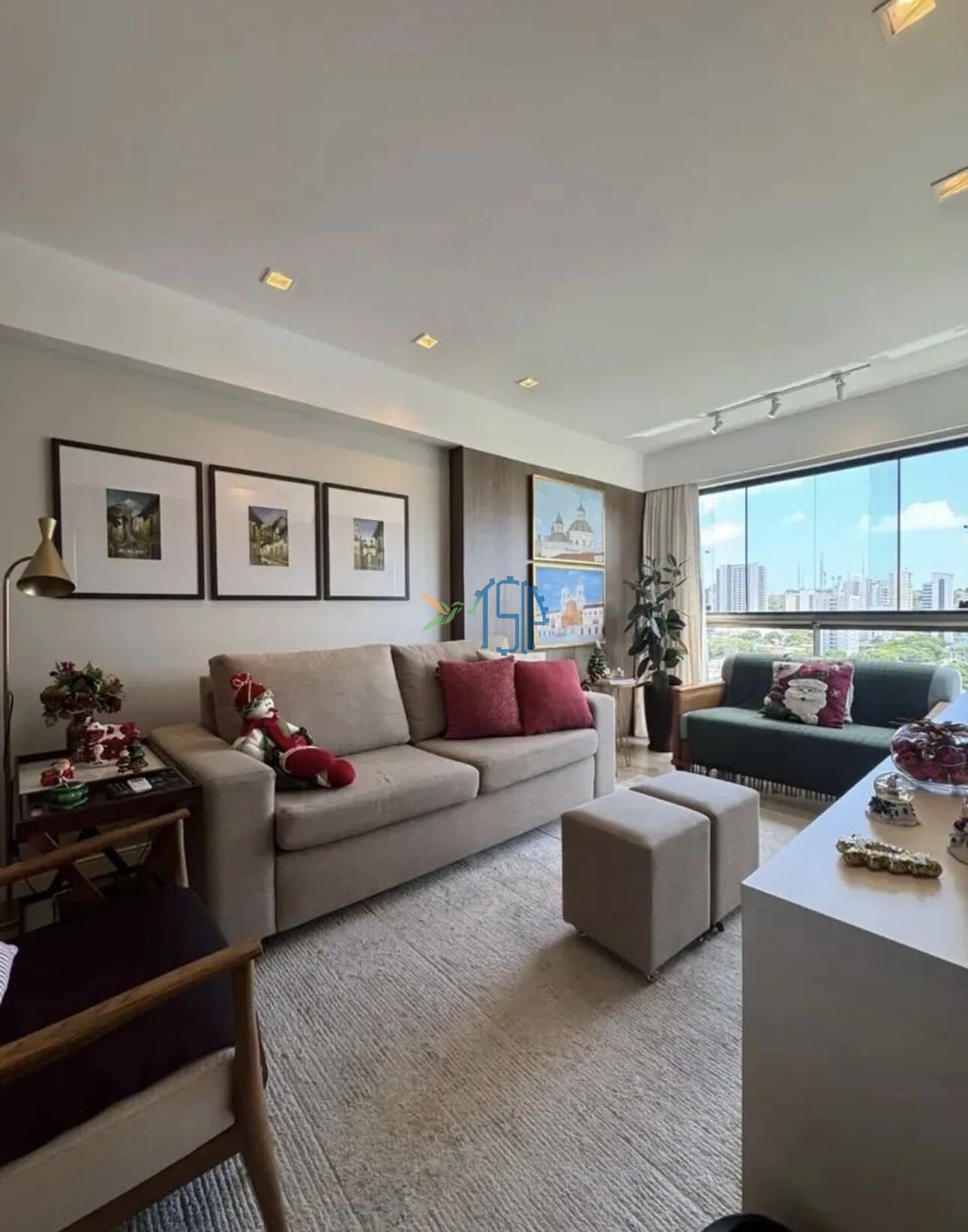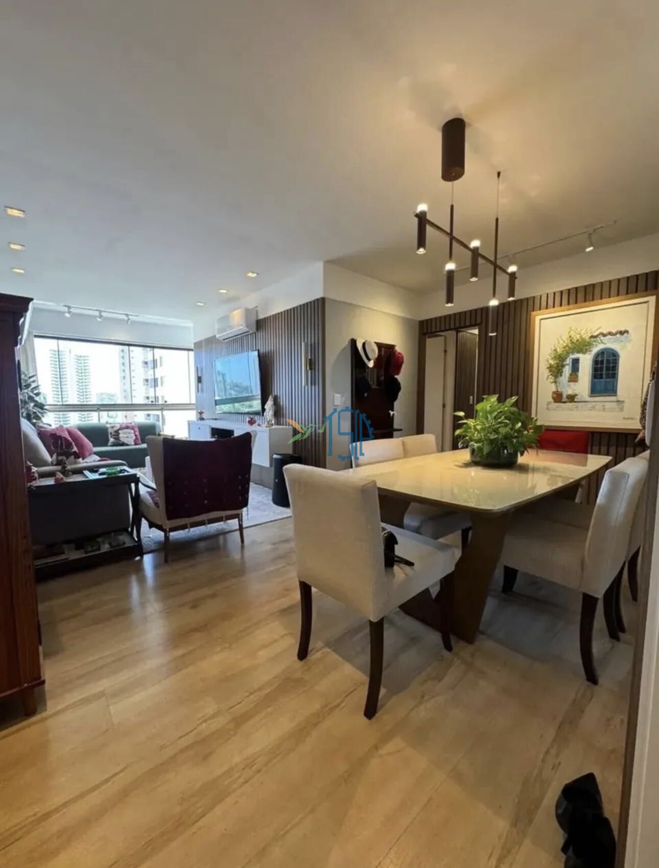 Sala integrada à varanda amplitude, iluminação natural e um toque de sofisticação.