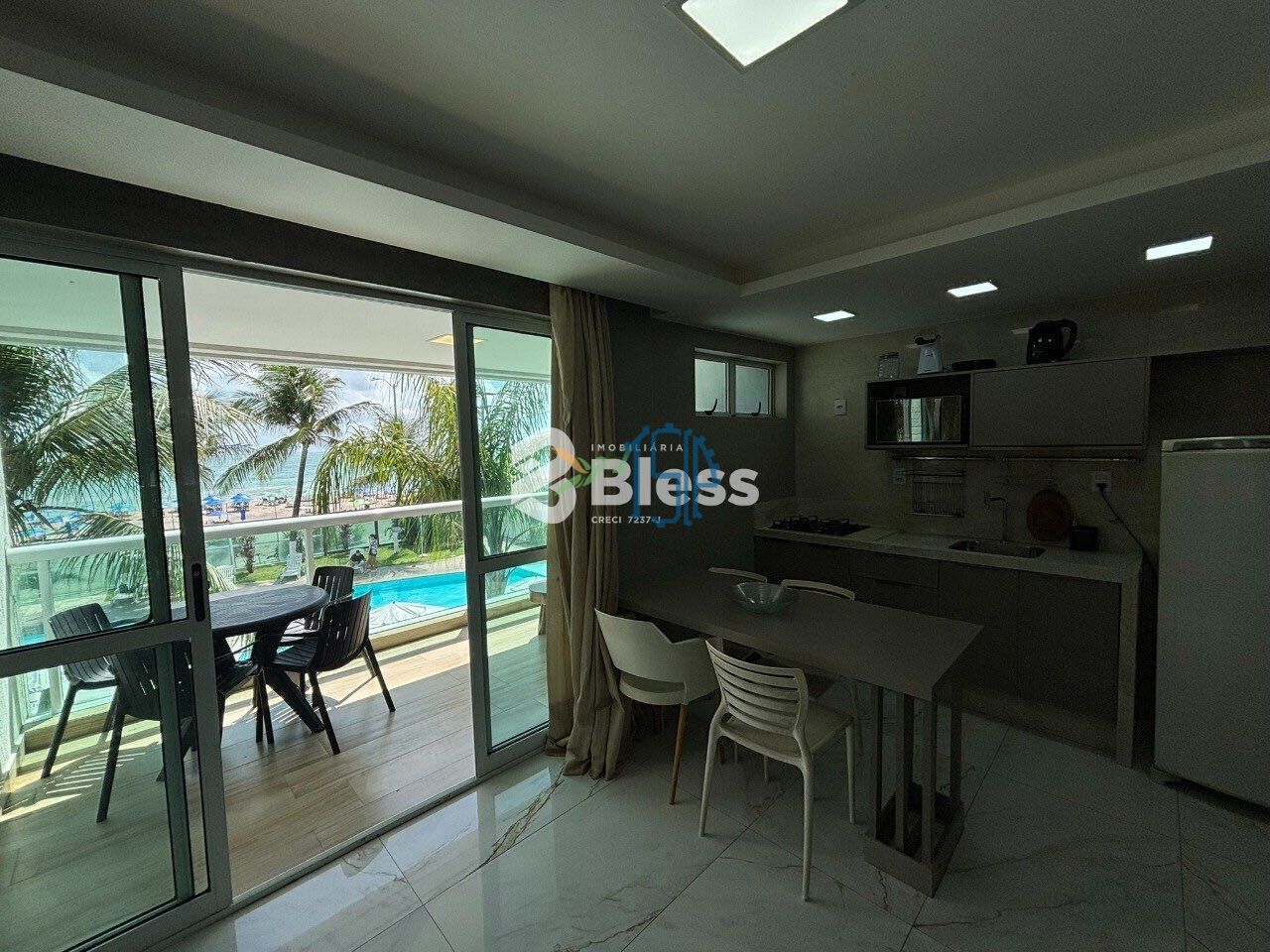🏢 Estrutura completa: piscina frente mar, academia, restaurante, recepção e acesso direto à praia.