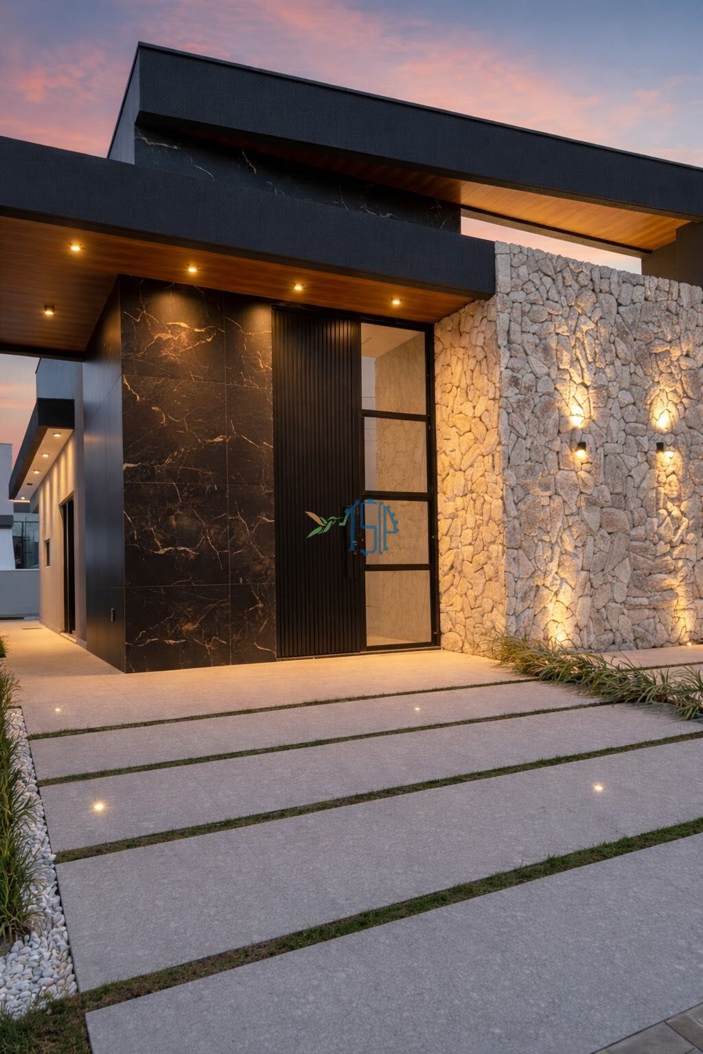 -Detalhes de fita de led na fachada e jardim com plantas